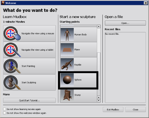 of the Welcome window, select the Sphere sculpt