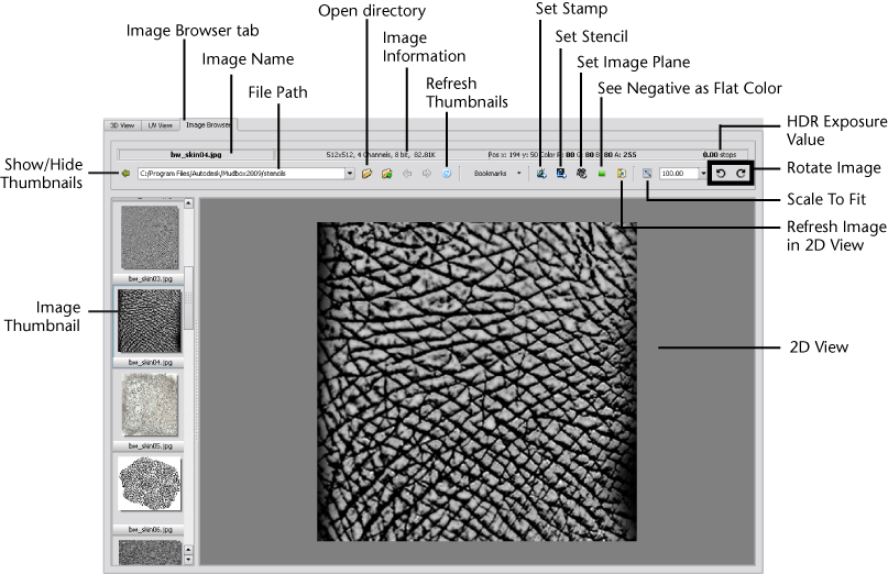 The Image Browser lets you select, view, and evaluate 2D images and textures located on your local hard drive or network.