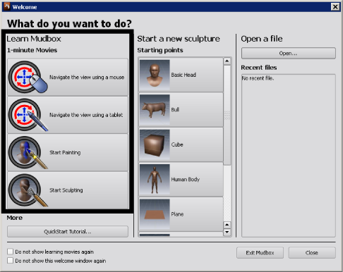 If you've never used Mudbox before, begin by watching the one minute movies that appear on the Welcome window when you first launch Mudbox. These movies contain essential tips and tricks for using Mudbox.