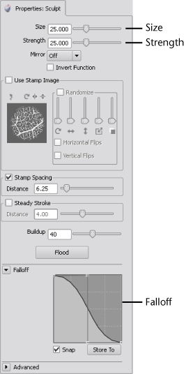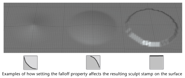 The Falloff property controls the profile (cross-section) of a sculpt tool and determines how the sculpt tool diminishes from its center towards its outer edge. Depending on how you set the falloff, your sculpt strokes can feather off gently, blending smoothly with the surrounding surface, or appear with a sharp edge.