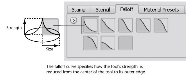 You can quickly modify a sculpt tool’s falloff by clicking a Falloff preset from the Falloff tray. The curve you select is immediately assigned to the tool properties. The falloff curve is always symmetrical.