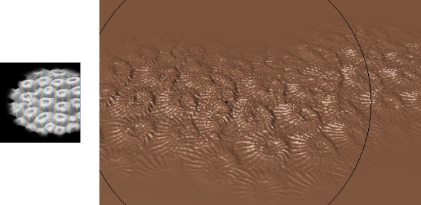 As you stroke, the stamp detail is applied and repeated along your stroke automatically. If you want more spacing between the individual stamps, increase the Stamp Spacing property in the properties window. You can also have the stamp orient its direction to the stroke path. For more information, see the Sculpt Tool properties.