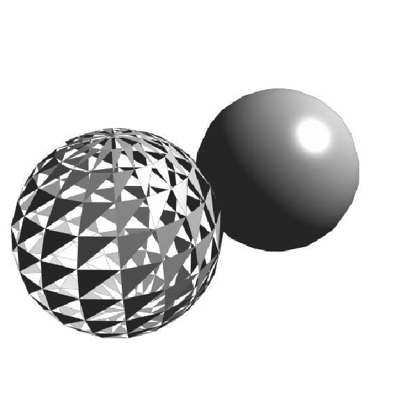 Here is the resulting image when this scene is rendered. The smooth sphere on the right is the original sphere, which got passed to the facet example shader to generate the front sphere. The shader has copied every other triangle of the sphere but omitted the normals.