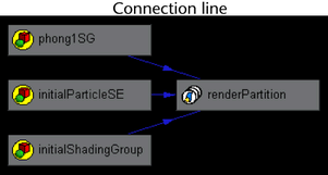 The connection lines between nodes show connection direction. The connection line originates at a node that outputs data, and the line points to a node receiving the data as input. The example above shows that the flow of output goes from the phong1SG shading group to the renderPartition.