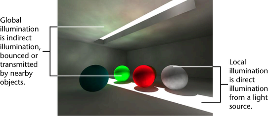 With global illumination, the contribution of bounced light from other surfaces in the scene is used to calculate the overall light contribution and the color values at points on objects that are not directly illuminated (that is, at points that do not receive light directly from a light source, such as a spot light).