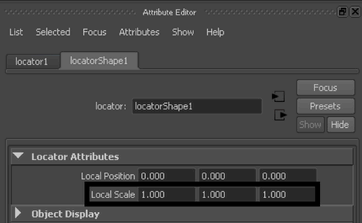 An attribute on the locator shape node allows you to change the locator’s local scale; that is, you can change the size of the locator (without affecting any objects that are parented or constrained to the locator).