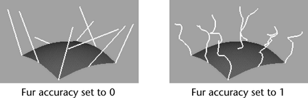 Set how closely the fur feedback resembles the appearance of the final rendered fur. This is particularly useful for representing scraggle and curl. Fur accuracy ranges from 0 to 1. A value of 0 represents the hairs as straight lines, regardless of any curl, scraggle, or attraction. A value of 1 uses the same number of segments for each hair in the fur feedback that will be used for the actual render, but significantly slows interaction. A value of 0.5 uses half the number of segments in the fur feedback that will be used in the actual render, and is often sufficient to give a good indication of what the final fur render will look like.