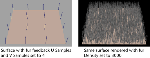 Set the number of U Samples and V Samples to define how many fur feedback hairs display on the surface. This does not change how many hairs actually render on the surface, only the number of fur feedback hairs that appear on the surface while you are working on it.