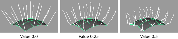 Defines how much to offset the fur description (in world units) from the surface it is attached to. When the Offset value is 0, the roots of the fur hairs start growing from the surface. When the value is less than zero, the roots start growing from inside the surface. When the value is greater than zero, the roots start growing from outside the surface. You can paint, map, and animate Offset.