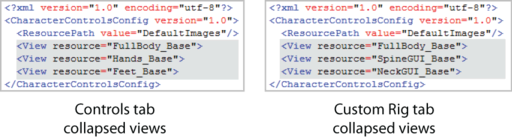 The configuration files are built around the views in the Controls tab (Full Body, Hands, and Feet) and the Custom Rig tab (Full Body, Spine, and Neck):