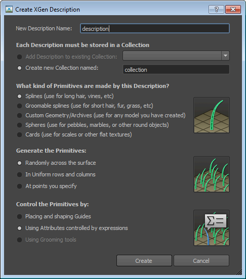 Use options in the Create XGen Description window to set the location, appearance, and behavior of the primitives you want to generate. When you create a new XGen Description, an XGen patch is created and bound to the selected polygon mesh. A Collectionis also created.