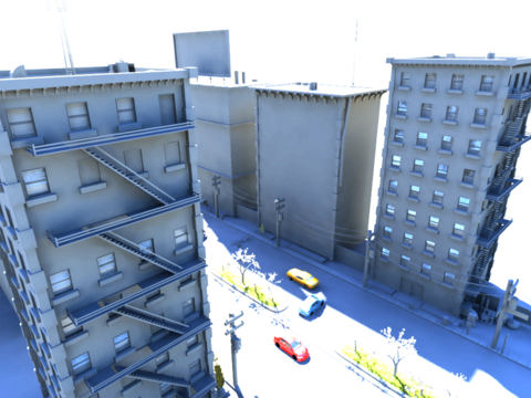 This example scene consists of a city view with buildings and cars, with the mia_physicalsun and mia_physicalsky shaders applied for lighting.