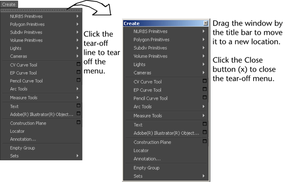 You can display menus as separate windows. This is helpful when you use a menu repeatedly. Pull down the menu and click the tear-off line at the top. Tear-off menus always display on top.