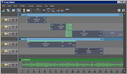 The Trax Editor is a high-level animation tool that lets you select and control characters and their animation clips, layer and blend animation sequences, synchronize your animation and audio clips, and drag-and-drop animation clips between mapped characters. See Mapping animation between characters in the Character Setup guide. You can work with any type of animation in the Trax Editor—except motion path animation.
