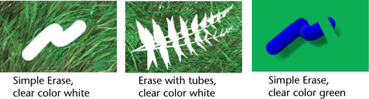 You can erase paint from the canvas using any brush by setting the brush type to . Painting over an image on the canvas with an brush removes the color from the painted pixels, revealing the underlying canvas and maintaining the shape of the brush. For example, if the brush has leaves, the color is removed where the leaves are painted.