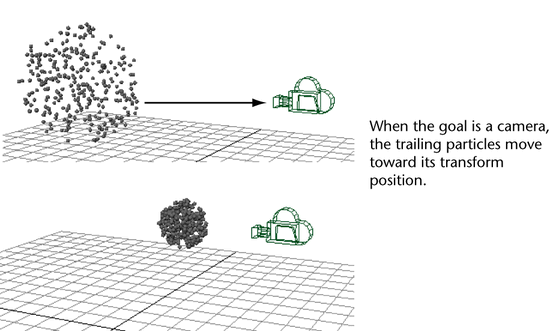 If the goal is a NURBS object, polygonal object, or lattice, its CVs, vertices, or lattice points attract the particles one for one. Extra particles follow the points in the goal object by starting over at the beginning points. The method is the same as described for particle objects.
