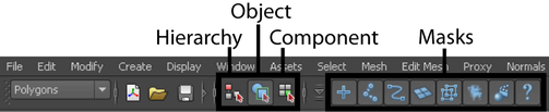 There are three selection modes: Hierarchy, Object and Component. You use these modes in order to limit or mask the selection of other objects in order to select only the types of items you want. When you use a selection mask you are filtering out or masking items you don’t want to be chosen as part of the selection.