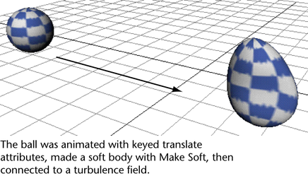 For instance, suppose you make a sphere a soft body with Duplicate, Make Copy Soft and Make Non-Soft a Goal selected. Next, you set keys to animate the motion of the goal object, which is the original sphere. You then give the particles of the soft body copy various goalPP values. When you play the animation, the soft body copy deforms like jiggling gelatin as it follows the original sphere. Note that you’ll typically hide the original sphere by turning on Hide Non-Soft Object.