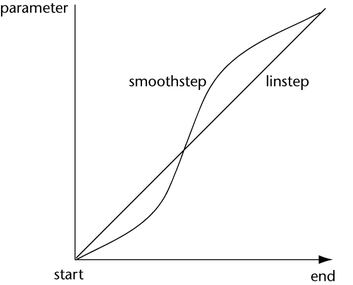 The smoothstep function works like the linstep function, except it increases values more quickly near the middle values between the minimum and maximum value. The function uses hermite interpolation between minimum and maximum values.