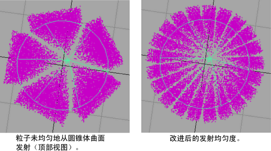 可以从 NURBS 曲面发射器更均匀地扩散发射。该功能通常适用于有尖锐曲线或弯曲度高的曲面。