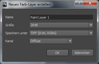 Das Fenster Neuen Farb-Layer erstellen wird angezeigt, wenn Sie ein Modell das erste Mal bemalen. Es wird auch angezeigt, wenn Sie mit dem Fenster Farb-Layer einen neuen Farb-Layer erstellen. Siehe auch Erstellen eines neuen Farb-Layers.