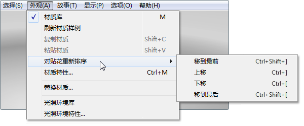 - 选择“材质”>“对贴花重新排序”,然后选择贴花在层内的移动方向: