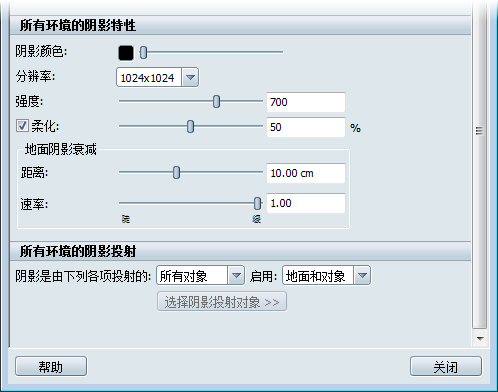 这些选项仅在选中“投射阴影”时才可用,并且适用于所有环境。