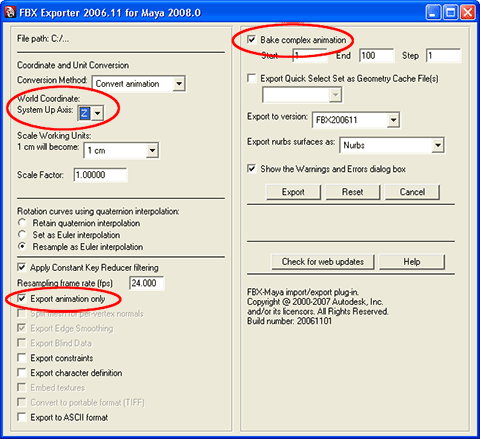 可用于 FBX 导入的选项将随所用动画应用程序的不同而不同。Autodesk Maya 和 Autodesk 3DStudio Max 具有强大而完整的 FBX 支持,建议将其用于此工作。