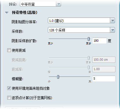 - 在“环境遮挡阴影”窗口中,单击“预设特性(高级)”旁的箭头 (