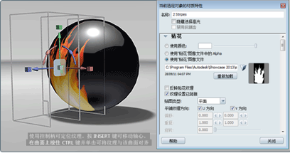 将出现贴花纹理的纹理操纵器,并将打开“材质特性”窗口。如果处于光线跟踪模式,则显示的边界框可能不一致。要解决此问题,请先停止再重新启动光线跟踪模式,或者以硬件渲染模式工作。