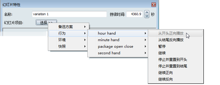 不能多次为某行为添加同一操作;例如,如果为转盘 1 添加“从开始正向播放”,则不能为当前幻灯片中的该转盘再次添加此操作。所有其他动作仍然可以添加,且在“选择”菜单中可用。
