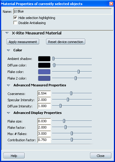 X-Rite 材质派生自使用 X-Rite MA98 分光光度计从实际油漆采样中扫描的数据。这些材质可以像其他任何材质(贴花除外)一样应用于场景中的对象,并且可以对一些基本参数进行调整。