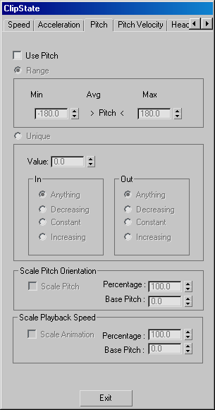 These settings let you scale the pitch at which the animation is played, depending upon the pitch of the delegate. By default, when Scale Pitch is off, the animated object will pitch normally. If you turn it on, you can then set a Base Pitch at which the animation should play, plus a percentage to specify how much the Base Pitch is modified by the actual delegate pitch. If the Percentage is 100, then only the Base Pitch will be used; anything else will scale between the base pitch and the delegate pitch. This is useful for when birds and other objects elevate, but don’t pitch up.
