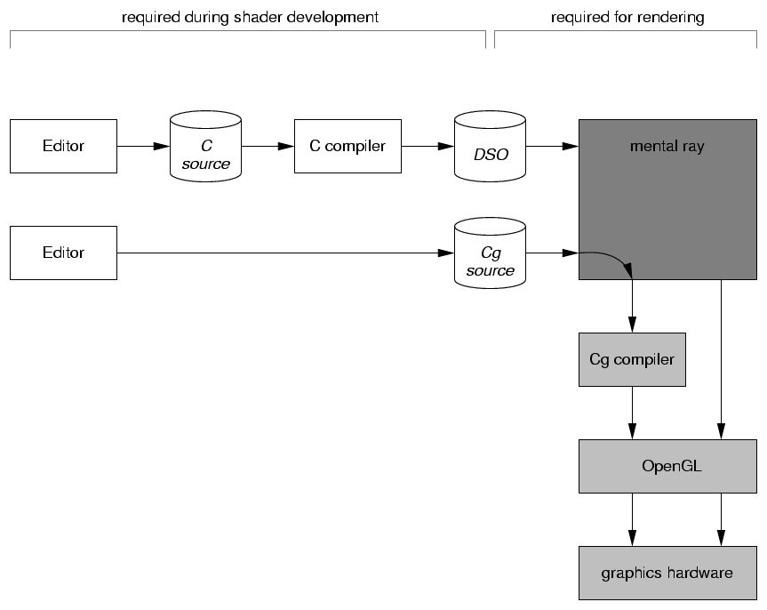 mental ray uses OpenGL not only for defining a scene, but also to load hardware shaders. Hardware shaders include the vertex and fragment shader, precompiled uniform variables, and additional parameters. Just as mental ray relies on external shared libraries (DSO)s containing precompiled C/C++ software shaders, it relies on external libraries containing hardware shaders. The libraries are created by external compilers such as NVIDIA's Cg compiler from source code provided by the shader writer: