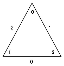 The numbers inside the triangle indicate vertex numbers, the numbers at the three edges indicate the corresponding bit position in the crease bitmap. Bit 0 is assumed to be the least significant bit. Here is an example where edges 0 and 1 in a triangle should be crease edges, with corresponding sharpness values of 0.7 and 1.0: