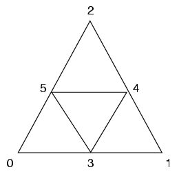 The optional crease statement allows specification of crease edges. With crease_mask up to four edges are selected for crease, the floating point sharpness values follow in the sharpness_list. crease_mask is a bitmap where crease edge indices are associated with corresponding bit positions in the mask. The diagram below shows the vertex and edge labeling of a base triangle: