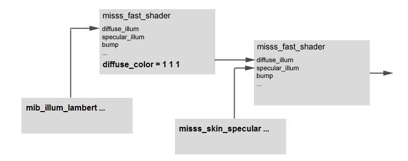 This graph shows how a 2nd iteration of misss_fast_shader is used as the diffuse_illum parameter of the 1st. This works because the scattering function receives its diffuse illumination from the lightmaps, and does not care about what diffuse_illum actually returns. It simply layers it into the mix.