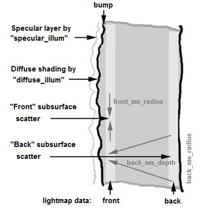 To create the subsurface scattering itself, light from specially prepared lightmaps is gathered, weighted by distance, and tinted. The whole stack is finally layered together as follows, from top to bottom.