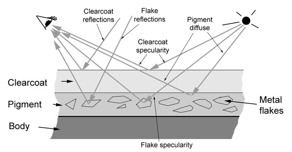 On top of this is a clearcoat layer, which can be more or less reflective and more or less glossy, depending on the quality of the layer and any added wax coating. Most notably, this layer tends to exhibit a pronounced fresnel effect, reflecting more light at glancing angles.