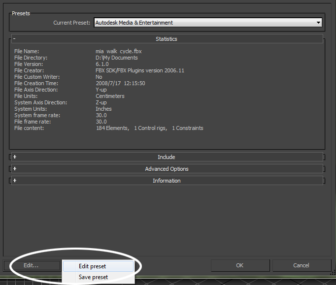 The 3ds Max FBX Plug-in stores custom presets in a file so you can share them with other users. For more information, see Storing presets.