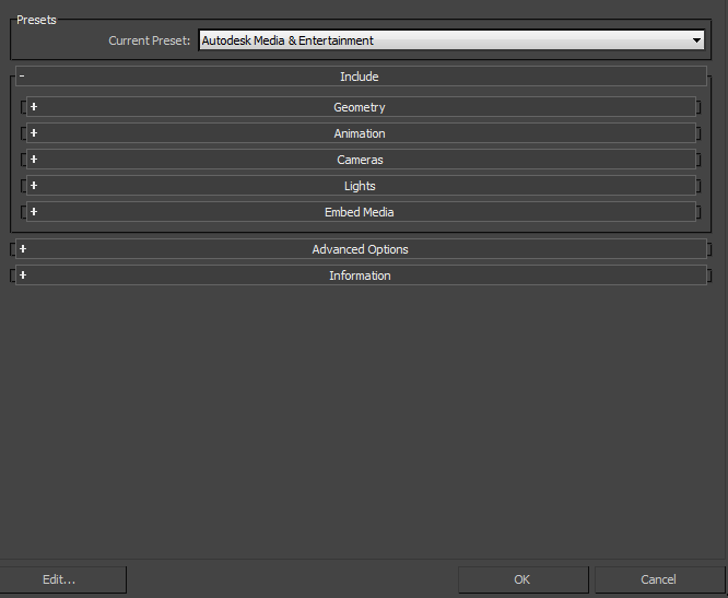 The Autodesk Media and Entertainment preset contains the optimal settings for most animation workflows.
