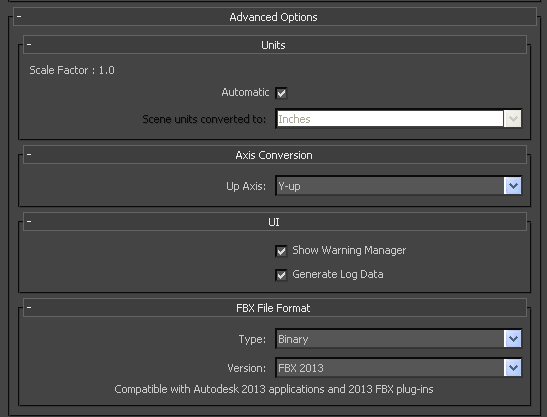 The Advanced Options rollout primarily contains additional options that let you modify the default plug-in behavior. In most cases you do not need to modify these options to have a successful export. The section also holds additional settings specific to the Collada file type.