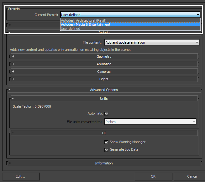 The default preset is based on the application version you are using. If you use 3ds Max, Autodesk Media and Entertainment is the default preset. If you use 3ds Max Design, Autodesk Architectural (Revit) is the default preset.