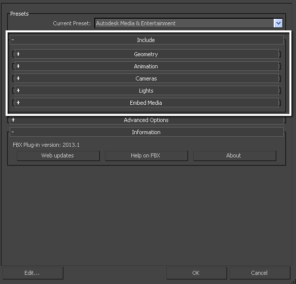 The Include rollout lets you decide what data and conversions the plug-in applies to your scene at export from a host application.