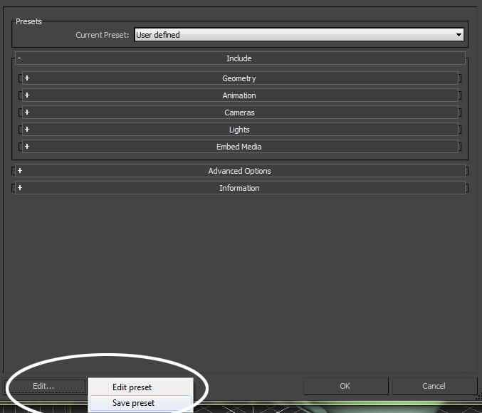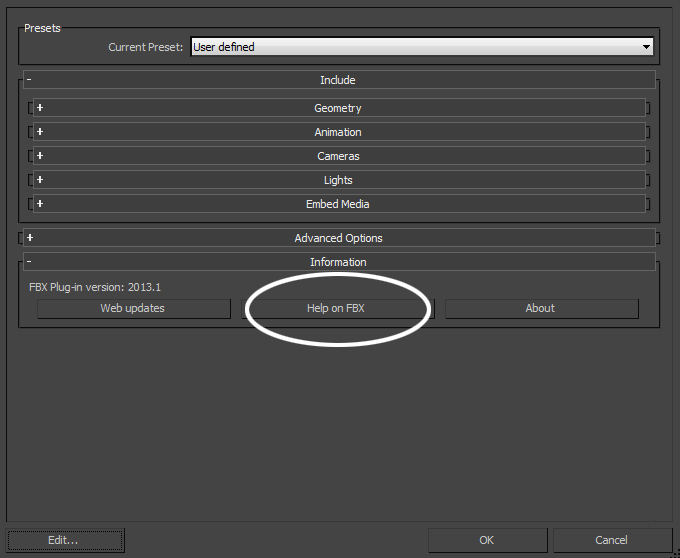Access the Edit/Save preset options through the Edit button in the FBX plug-in UI.