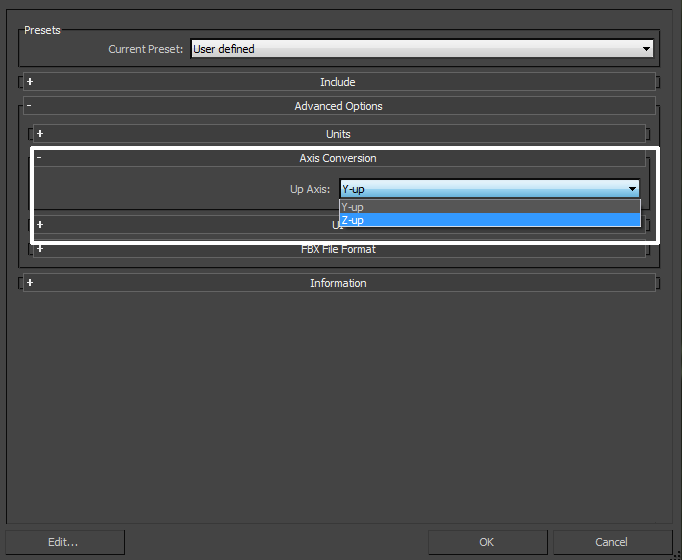 NoteThe exporter applies Axis Conversions only to root elements of the outgoing scene. If you have animation on a root object