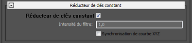 Le filtre Réducteur de clés présente par défaut une valeur de précision de 1.0 et l'option de synchronisation des courbes XYZ est désactivée.