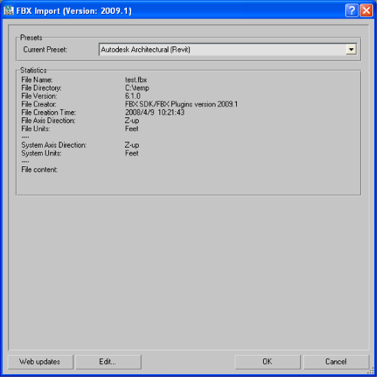 The Autodesk Architectural (Revit) preset is a simplified version of the FBX UI. It has optimal settings for architectural workflows translating data from the Autodesk Revit application, to Autodesk 3ds Max Design. The preset exposes no options, only the Preset, and Statistics sections.