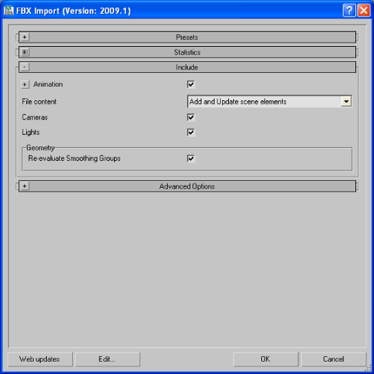 The Include rollout lets you decide what data and conversions to apply to your scene at import from a host application.