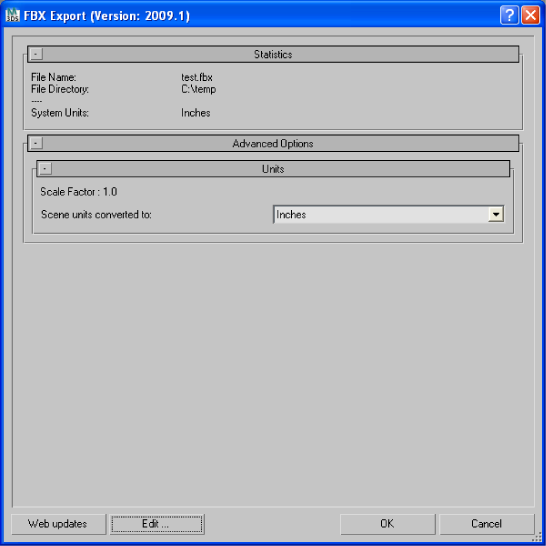 If you export a file that is in the same Unit setting as the System Units of your 3ds Max scene, there is a match of units and the displayed Scale Factor will be “1.0”. No scale conversion is applied.